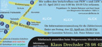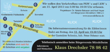 Wir wollen den Verkehrsfluss von PKWs und LKWs (ab 3,5 t) am 15. April 2013 von 6:00 bis 19:00 Uhr