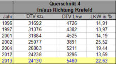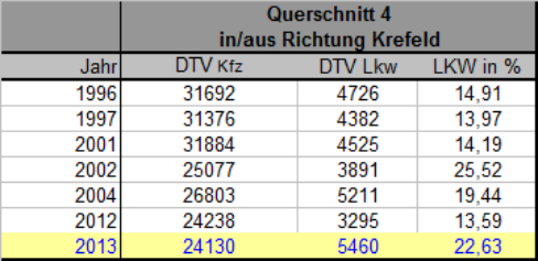 durchschnittliches tägliches LKW-Verkehrsaufkommen in %im Querschnitt 4(in/aus Richtung Krefeld)