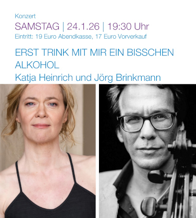 Katja Heinrich (Gesang) und Jörg Brinkmann (Cello) präsentieren Werke u.a. von Kurt Weill, Zarah Leander, Kurt Tucholsky, Joachim Ringelnatz und den Comedian Harmonists.