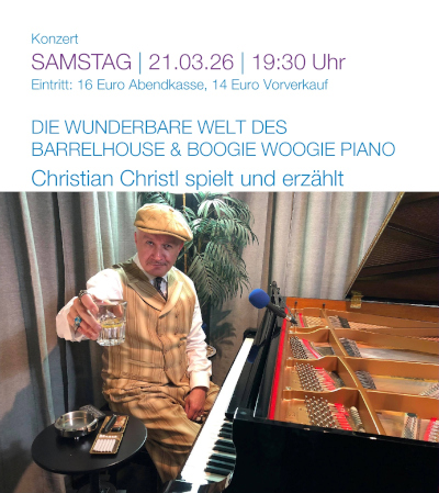 Der Blues- und Boogie Pianist Christian Christl nimmt Sie mit in eine Zeit, als die ersten Radiosender in Amerika noch Live-Konzerte übertrugen und Zugfahren modern wurde, als in den Kneipen noch Klaviere standen und Musiker von Stadt zu Stadt, von Dorf zu Dorf reisen konnten, um in den Barrelhouses Arbeit zu finden.