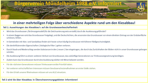 der Bürgerverein Mündelheim, genauer das Team „Kies“ des Bürgervereins Mündelheim, informieren Sie in der nächsten Zeit über unterschiedliche Aspekte im Zusammenhang mit der Auskiesung.