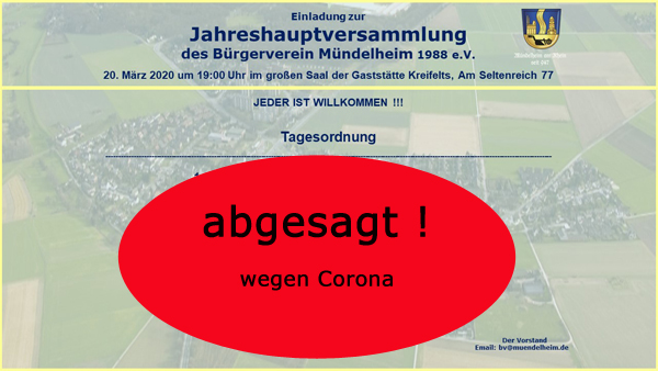 Wir haben uns deshalb entschlossen, die Mitgliederversammlung für Freitag, 20.03.2020 abzusagen.