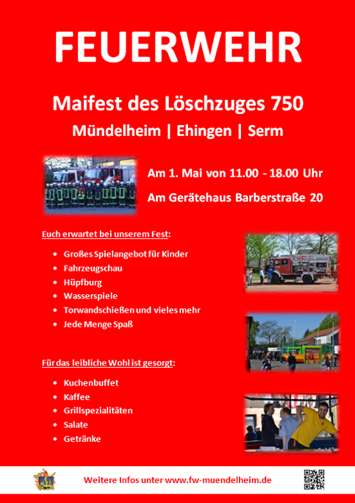 Am 01.05. veranstaltet der Löschzug 750 Mündelheim / Ehingen / Serm zwischen 11 und 18 Uhr mit seinem Maifest wieder eines der traditionellen Frühlingsfeste im Duisburger Süden. Rund um das Gerätehaus an der Barberstraße 20 wird neben einem Tag der offenen Tür auch wieder das beliebte Menschenkicker-Turnier ausgerichtet.