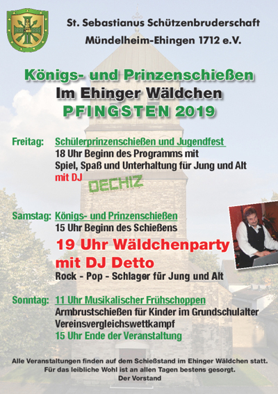 Die Sankt Sebastianus Schützenbruderschaft Mündelheim-Ehingen 1712. e.V. wird auch in diesem Jahr wieder das Königs-, Prinzen- und Schülerprinzenschießen auf dem Schießstand im "Ehinger Wäldchen" veranstalten: